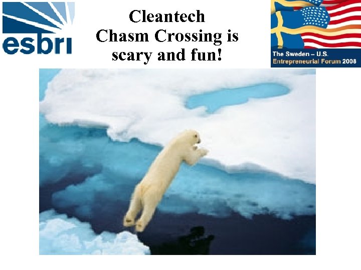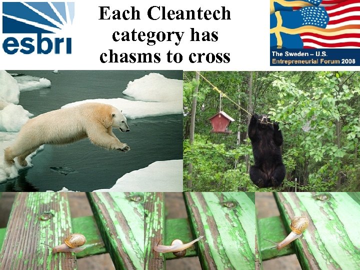 Agenda • • • Has Cleantech crossed the Chasm? Cleantech VC investment Trends Cleantech Categories Each Cleantech category has chasms to cross Tried and True Models are taking cleantech innovations to market Visionary VCs are fishing for winners Visionary cleantech VCs in Silicon Valley Cleantech chasm crossing is scary and fun! Sweden is a hothouse for cleantech innovation!
