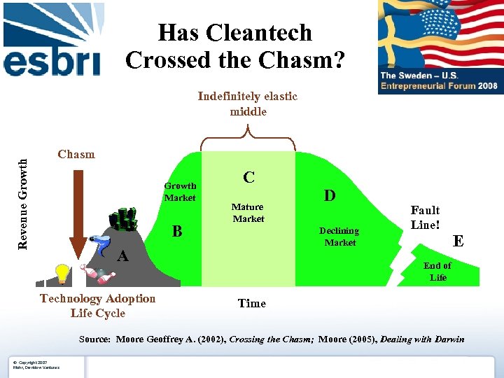 Has Cleantech Crossed the Chasm? Revenue Growth Indefinitely elastic middle Chasm Growth Market B C Mature Market Declining Market A Technology Adoption Life Cycle D Fault Line! E End of Life Time Source: Moore Geoffrey A. (2002), Crossing the Chasm; Moore (2005), Dealing with Darwin ® Copyright 2007 Mohr, Davidow Ventures