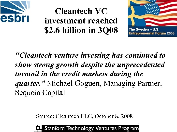 Cleantech VC investment reached $2. 6 billion in 3 Q 08 "Cleantech venture investing has continued to show strong growth despite the unprecedented turmoil in the credit markets during the quarter. ” Michael Goguen, Managing Partner, Sequoia Capital Source: Cleantech LLC, October 8, 2008