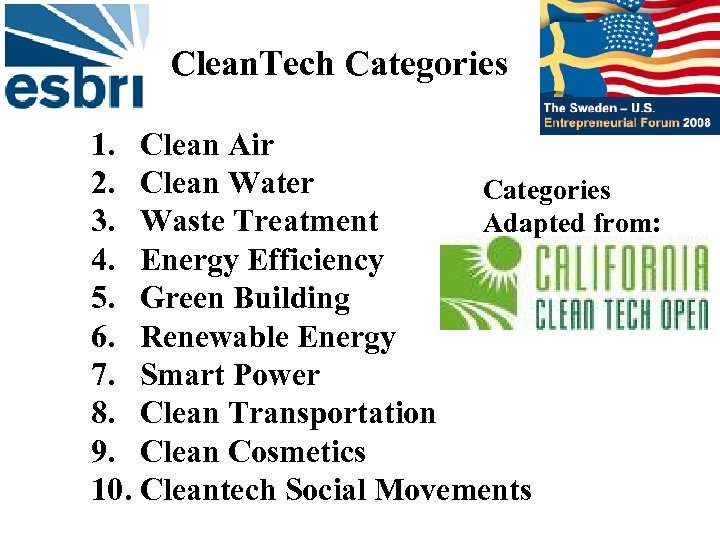 Clean. Tech Categories 1. Clean Air 2. Clean Water Categories 3. Waste Treatment Adapted from: 4. Energy Efficiency 5. Green Building 6. Renewable Energy 7. Smart Power 8. Clean Transportation 9. Clean Cosmetics 10. Cleantech Social Movements