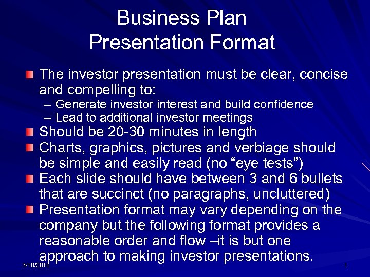 Business Plan Presentation Format The investor presentation must be clear, concise and compelling to: – Generate investor interest and build confidence – Lead to additional investor meetings Should be 20 -30 minutes in length Charts, graphics, pictures and verbiage should be simple and easily read (no “eye tests”) Each slide should have between 3 and 6 bullets that are succinct (no paragraphs, uncluttered) Presentation format may vary depending on the company but the following format provides a reasonable order and flow –it is but one approach to making investor presentations. 3/18/2018 1