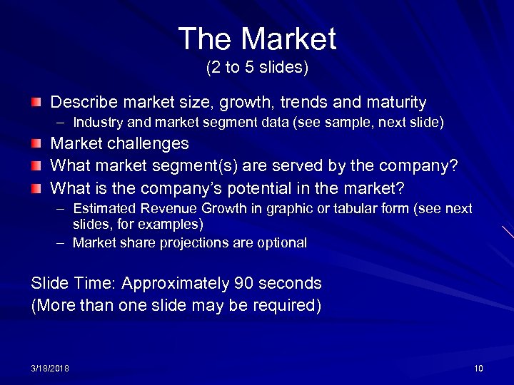 The Market (2 to 5 slides) Describe market size, growth, trends and maturity – Industry and market segment data (see sample, next slide) Market challenges What market segment(s) are served by the company? What is the company’s potential in the market? – Estimated Revenue Growth in graphic or tabular form (see next slides, for examples) – Market share projections are optional Slide Time: Approximately 90 seconds (More than one slide may be required) 3/18/2018 10