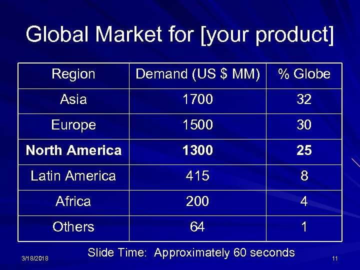 Global Market for [your product] Region Demand (US $ MM) % Globe Asia 1700 32 Europe 1500 30 North America 1300 25 Latin America 415 8 Africa 200 4 Others 64 1 3/18/2018 Slide Time: Approximately 60 seconds 11