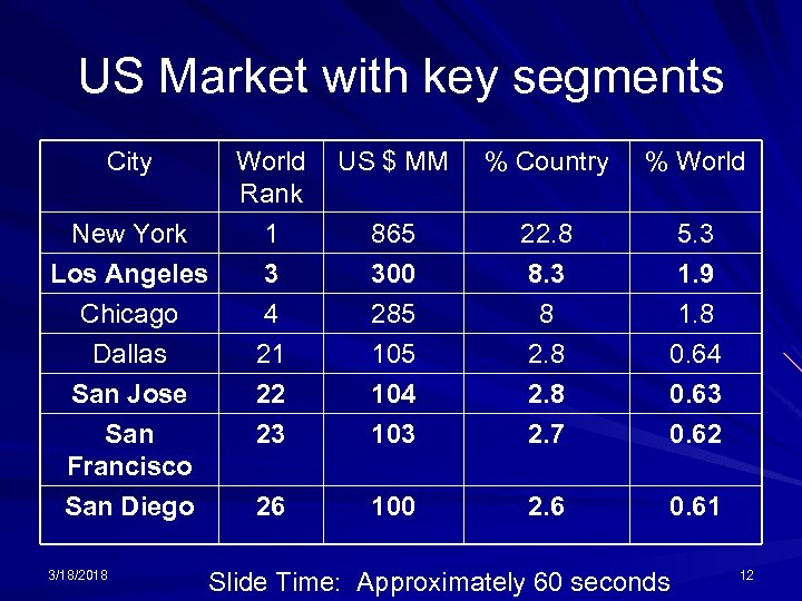US Market with key segments City New York Los Angeles Chicago Dallas San Jose San Francisco San Diego 3/18/2018 World Rank 1 3 4 21 22 23 26 US $ MM % Country % World 865 300 22. 8 8. 3 5. 3 1. 9 285 104 103 8 2. 7 1. 8 0. 64 0. 63 0. 62 100 2. 6 0. 61 Slide Time: Approximately 60 seconds 12