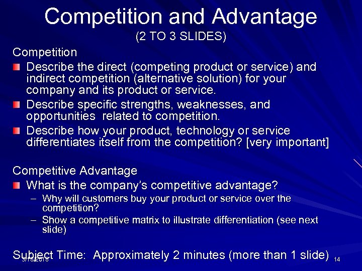 Competition and Advantage (2 TO 3 SLIDES) Competition Describe the direct (competing product or service) and indirect competition (alternative solution) for your company and its product or service. Describe specific strengths, weaknesses, and opportunities related to competition. Describe how your product, technology or service differentiates itself from the competition? [very important] Competitive Advantage What is the company’s competitive advantage? – Why will customers buy your product or service over the competition? – Show a competitive matrix to illustrate differentiation (see next slide) Subject Time: Approximately 2 minutes (more than 1 slide) 3/18/2018 14