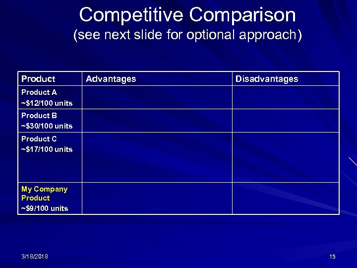 Competitive Comparison (see next slide for optional approach) Product Advantages Disadvantages Product A ~$12/100 units Product B ~$30/100 units Product C ~$17/100 units My Company Product ~$9/100 units 3/18/2018 15