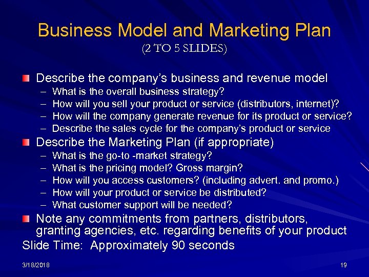 Business Model and Marketing Plan (2 TO 5 SLIDES) Describe the company’s business and revenue model – – What is the overall business strategy? How will you sell your product or service (distributors, internet)? How will the company generate revenue for its product or service? Describe the sales cycle for the company’s product or service Describe the Marketing Plan (if appropriate) – – – What is the go-to -market strategy? What is the pricing model? Gross margin? How will you access customers? (including advert. and promo. ) How will your product or service be distributed? What customer support will be needed? Note any commitments from partners, distributors, granting agencies, etc. regarding benefits of your product Slide Time: Approximately 90 seconds 3/18/2018 19