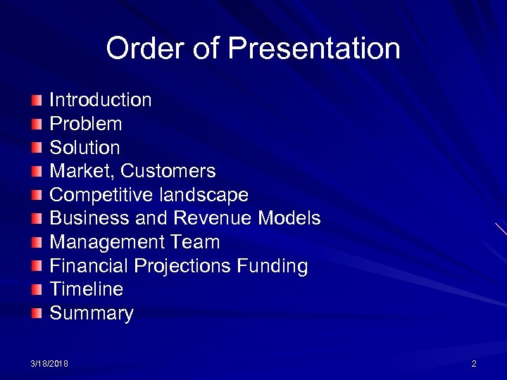 Order of Presentation Introduction Problem Solution Market, Customers Competitive landscape Business and Revenue Models Management Team Financial Projections Funding Timeline Summary 3/18/2018 2