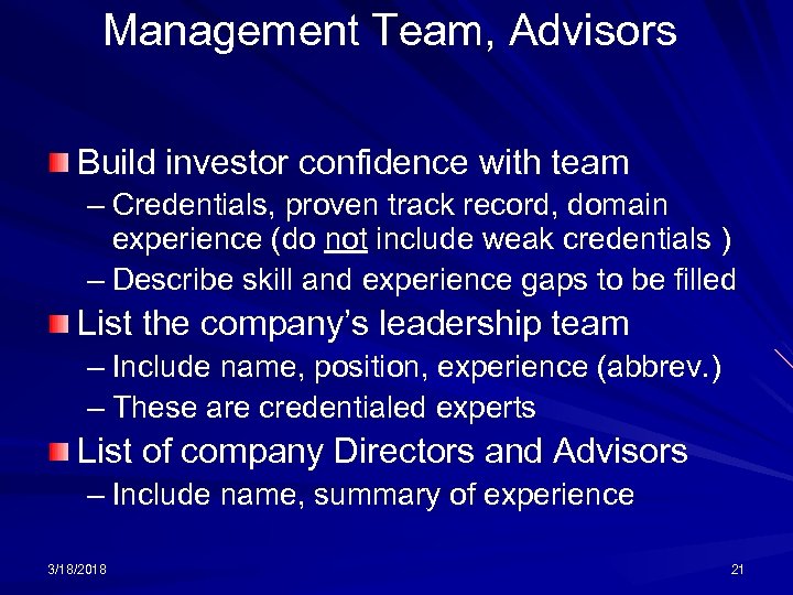 Management Team, Advisors Build investor confidence with team – Credentials, proven track record, domain experience (do not include weak credentials ) – Describe skill and experience gaps to be filled List the company’s leadership team – Include name, position, experience (abbrev. ) – These are credentialed experts List of company Directors and Advisors – Include name, summary of experience 3/18/2018 21