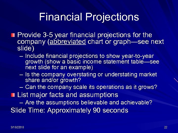 Financial Projections Provide 3 -5 year financial projections for the company (abbreviated chart or graph—see next slide) – Include financial projections to show year-to-year growth (show a basic income statement table—see next slide for an example) – Is the company overstating or understating market share and/or growth? – Can the company scale its operations as it grows? List major facts and assumptions – Are the assumptions believable and achievable? Slide Time: Approximately 90 seconds 3/18/2018 22