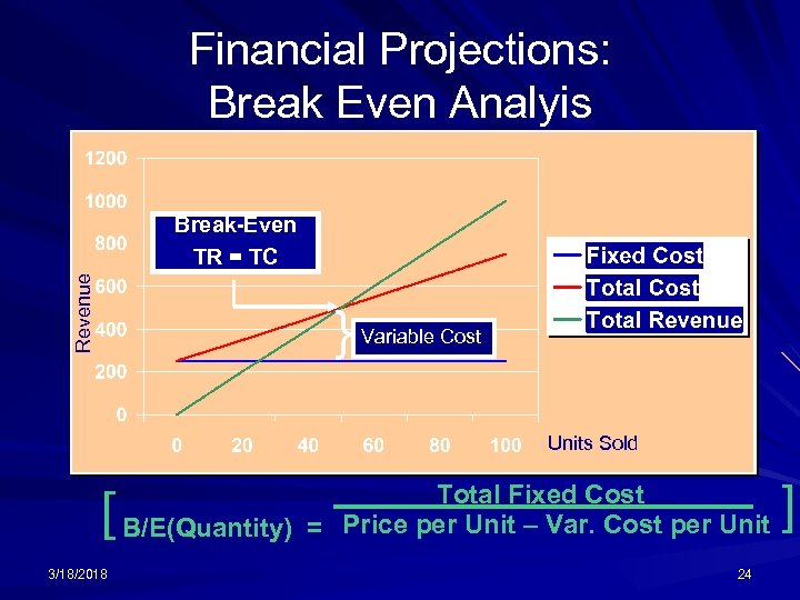 Financial Projections: Break Even Analyis Revenue Break-Even TR = TC } Variable Cost Units Sold [ 3/18/2018 Total Fixed Cost B/E(Quantity) = Price per Unit – Var. Cost per Unit 24 ]