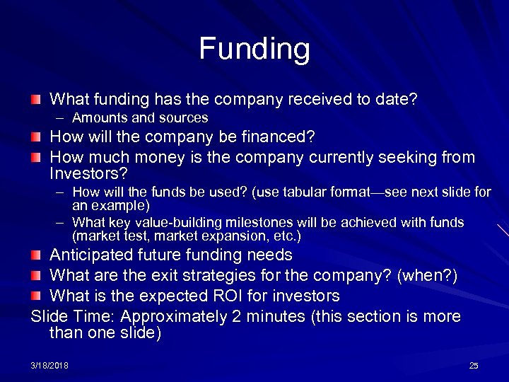 Funding What funding has the company received to date? – Amounts and sources How will the company be financed? How much money is the company currently seeking from Investors? – How will the funds be used? (use tabular format—see next slide for an example) – What key value-building milestones will be achieved with funds (market test, market expansion, etc. ) Anticipated future funding needs What are the exit strategies for the company? (when? ) What is the expected ROI for investors Slide Time: Approximately 2 minutes (this section is more than one slide) 3/18/2018 25