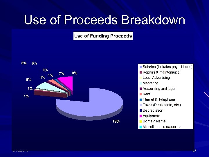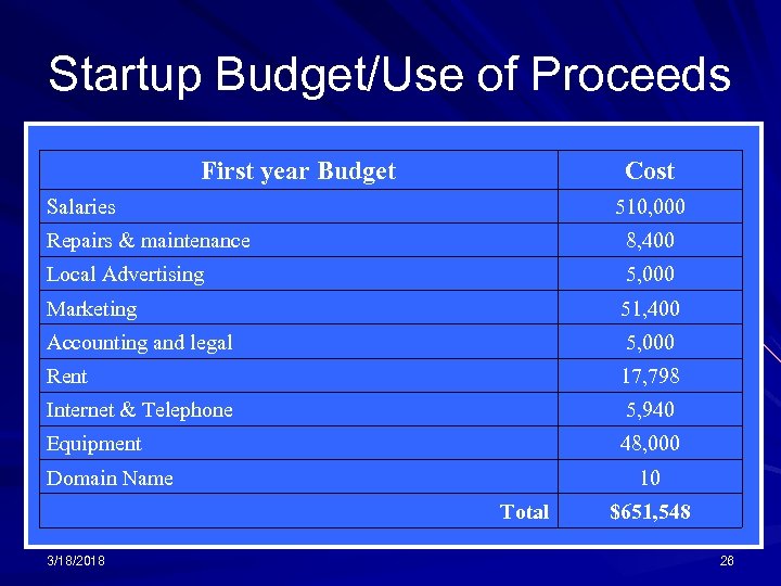 Startup Budget/Use of Proceeds First year Budget Cost Salaries 510, 000 Repairs & maintenance 8, 400 Local Advertising 5, 000 Marketing 51, 400 Accounting and legal 5, 000 Rent 17, 798 Internet & Telephone 5, 940 Equipment 48, 000 Domain Name 10 Total 3/18/2018 $651, 548 26