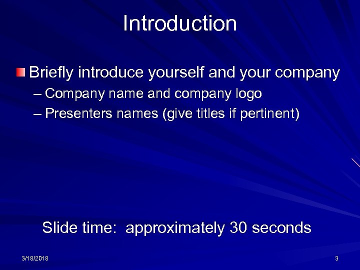 Introduction Briefly introduce yourself and your company – Company name and company logo – Presenters names (give titles if pertinent) Slide time: approximately 30 seconds 3/18/2018 3