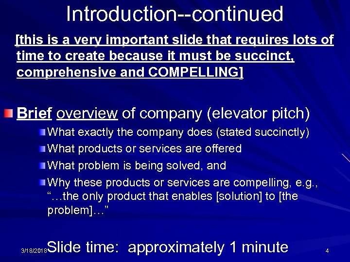 Introduction--continued [this is a very important slide that requires lots of time to create because it must be succinct, comprehensive and COMPELLING] Brief overview of company (elevator pitch) What exactly the company does (stated succinctly) What products or services are offered What problem is being solved, and Why these products or services are compelling, e. g. , “…the only product that enables [solution] to [the problem]…” Slide time: approximately 1 minute 3/18/2018 4