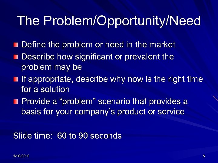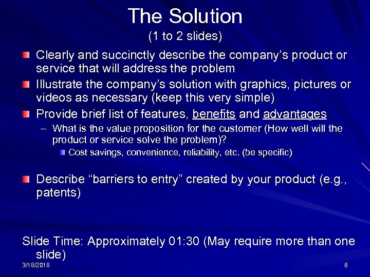 The Problem/Opportunity/Need Define the problem or need in the market Describe how significant or prevalent the problem may be If appropriate, describe why now is the right time for a solution Provide a “problem” scenario that provides a basis for your company’s product or service Slide time: 60 to 90 seconds 3/18/2018 5