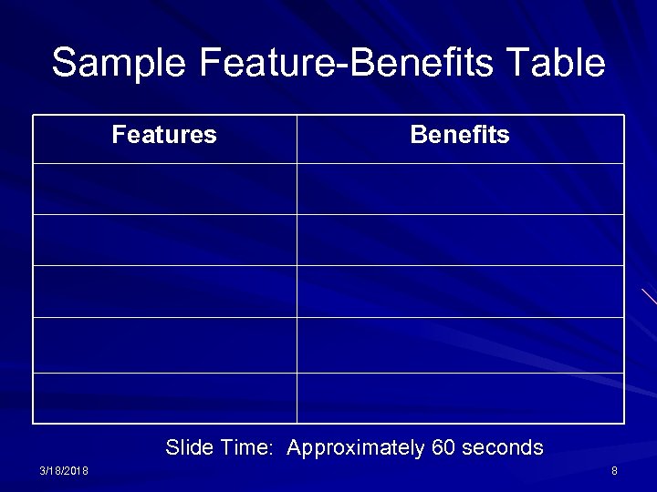 Sample Feature-Benefits Table Features Benefits Slide Time: Approximately 60 seconds 3/18/2018 8