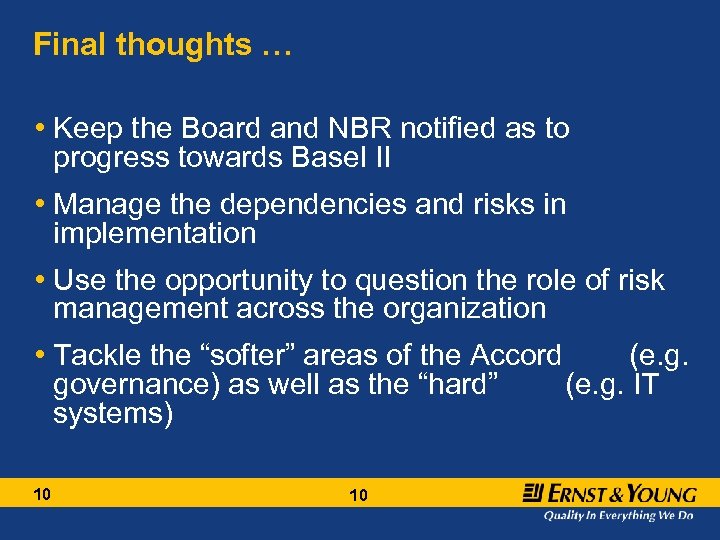 The role of risk management within the organisation is changing, but still requires further work to comply with Basel II Issues • Risk management functions in many banks are still young and finding their mandate within the organization, particularly for credit and operational risk • Traditional model of risk management often observed, with risk management being part of the credit process in full or in part leading to a lack of independence • Often a lack of transparency and awareness within the organization as to what RM’s role is • Skills often lacking with a lack of experience and background for key risk mgt roles • Operational risk units often do not have mandates or a clear role within the organization 9 Potential Solutions • Establish a clear charter for risk management and communicate across organization • Modify credit processes to remove RM from decision-making/ approvals • Review skills and recruit externally as required • Establish an operational risk framework, including an operational risk policy, with clear governance and reporting structures defined 9