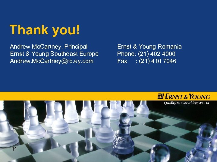 Thank you! Andrew Mc. Cartney, Principal Ernst & Young Southeast Europe Andrew. Mc. Cartney@ro. ey. com 11 Ernst & Young Romania Phone: (21) 402 4000 Fax : (21) 410 7046 !@ #