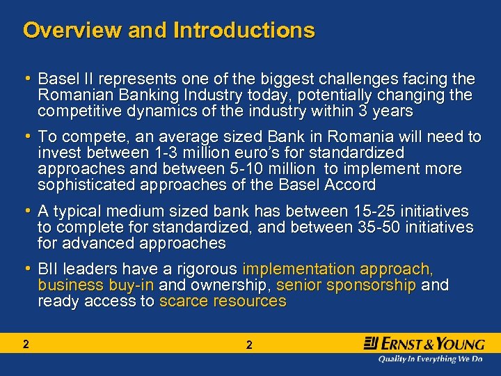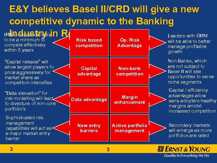 Overview and Introductions • Basel II represents one of the biggest challenges facing the Romanian Banking Industry today, potentially changing the competitive dynamics of the industry within 3 years • To compete, an average sized Bank in Romania will need to invest between 1 -3 million euro’s for standardized approaches and between 5 -10 million to implement more sophisticated approaches of the Basel Accord • A typical medium sized bank has between 15 -25 initiatives to complete for standardized, and between 35 -50 initiatives for advanced approaches • BII leaders have a rigorous implementation approach, business buy-in and ownership, senior sponsorship and ready access to scarce resources 2 2