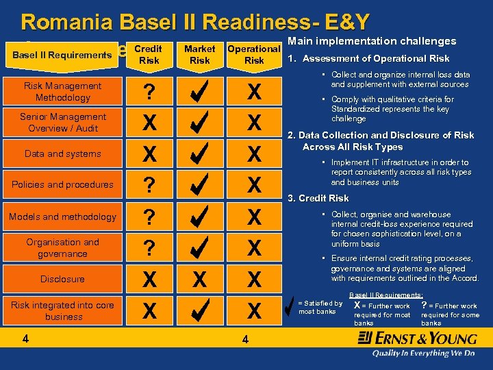 E&Y believes Basel II/CRD will give a new competitive dynamic to the Banking IRB Compliance likely Industry in Romania Leaders with ORM to be a minimum to compete effectively within 5 years “Capital release” will allow largest players to price aggressively for market share as competition intensifies “Data starvation” for risk modelling will lead to divesture of non-core portfolio’s Sophisticated risk management capabilities will act as a major market entry barrier 3 Risk based competition Op. Risk Advantage Capital advantage Non-bank competition Data advantage Margin enhancement New entry barriers Active portfolio management 3 will be able to better manage profitable growth Non-Banks, which are not subject to Basel II will see opportunities to serve niche segments Capital / efficiency advantages allow early adopters healthy margins amidst increased competition Secondary markets will emerge as more portfolios are rated