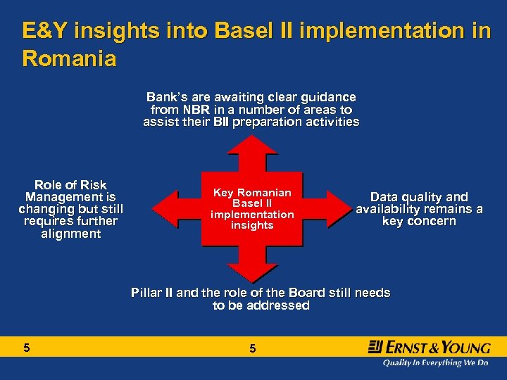 Romania Basel II Readiness- E&Y Main implementation challenges Credit Market Operational Assessment Basel II Requirements 1. Assessment of Operational Risk Risk Management Methodology Senior Management Overview / Audit Data and systems Policies and procedures Models and methodology Organisation and governance Disclosure Risk integrated into core business 4 ? X X ? ? ? X X X 4 • Collect and organize internal loss data and supplement with external sources • Comply with qualitative criteria for Standardized represents the key challenge 2. Data Collection and Disclosure of Risk Across All Risk Types • Implement IT infrastructure in order to report consistently across all risk types and business units 3. Credit Risk • Collect, organise and warehouse internal credit-loss experience required for chosen sophistication level, on a uniform basis • Ensure internal credit rating processes, governance and systems are aligned with requirements outlined in the Accord. Basel II Requirements: = Satisfied by most banks X = Further work ? = Further work required for most banks required for some banks