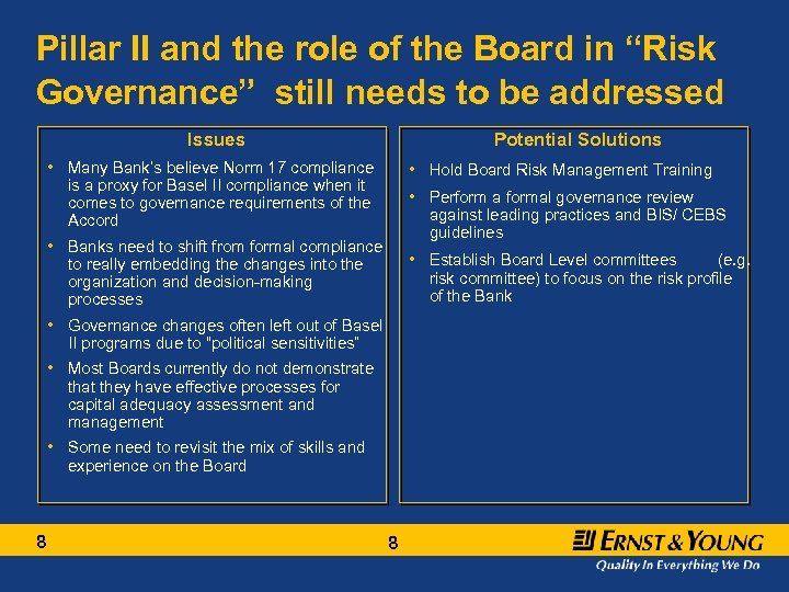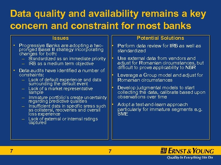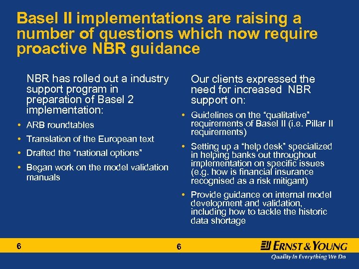 E&Y insights into Basel II implementation in Romania Bank’s are awaiting clear guidance from NBR in a number of areas to assist their BII preparation activities Role of Risk Management is changing but still requires further alignment Key Romanian Basel II implementation insights Data quality and availability remains a key concern Pillar II and the role of the Board still needs to be addressed 5 5