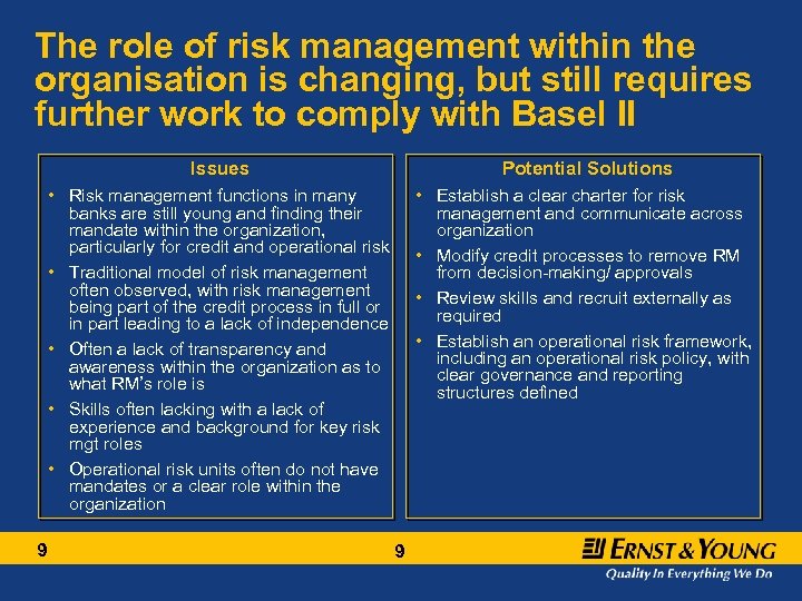 Pillar II and the role of the Board in “Risk Governance” still needs to be addressed Issues Potential Solutions • Many Bank’s believe Norm 17 compliance is a proxy for Basel II compliance when it comes to governance requirements of the Accord • Hold Board Risk Management Training • Perform a formal governance review against leading practices and BIS/ CEBS guidelines • Banks need to shift from formal compliance to really embedding the changes into the organization and decision-making processes • Establish Board Level committees (e. g. risk committee) to focus on the risk profile of the Bank • Governance changes often left out of Basel II programs due to “political sensitivities” • Most Boards currently do not demonstrate that they have effective processes for capital adequacy assessment and management • Some need to revisit the mix of skills and experience on the Board 8 8
