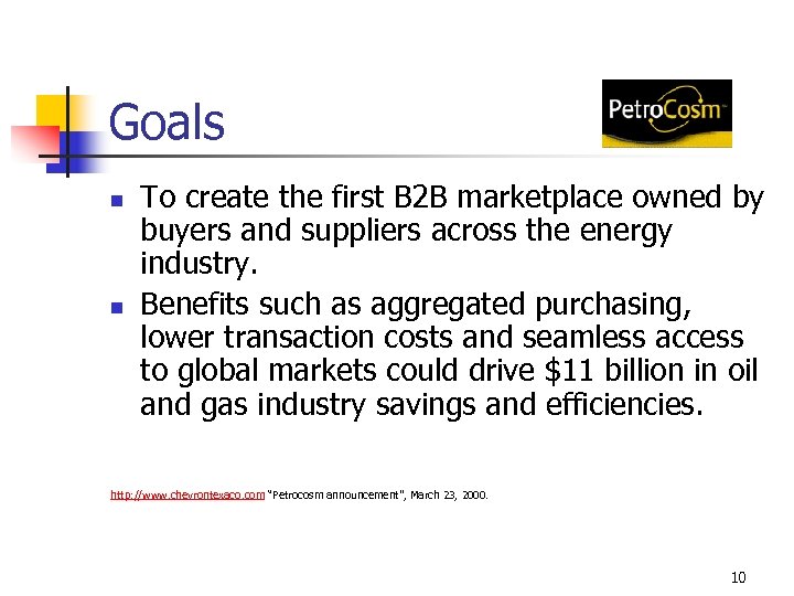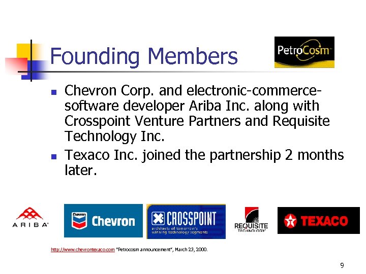 Founding Members n n Chevron Corp. and electronic-commercesoftware developer Ariba Inc. along with Crosspoint Venture Partners and Requisite Technology Inc. Texaco Inc. joined the partnership 2 months later. http: //www. chevrontexaco. com “Petrocosm announcement”, March 23, 2000. 9
