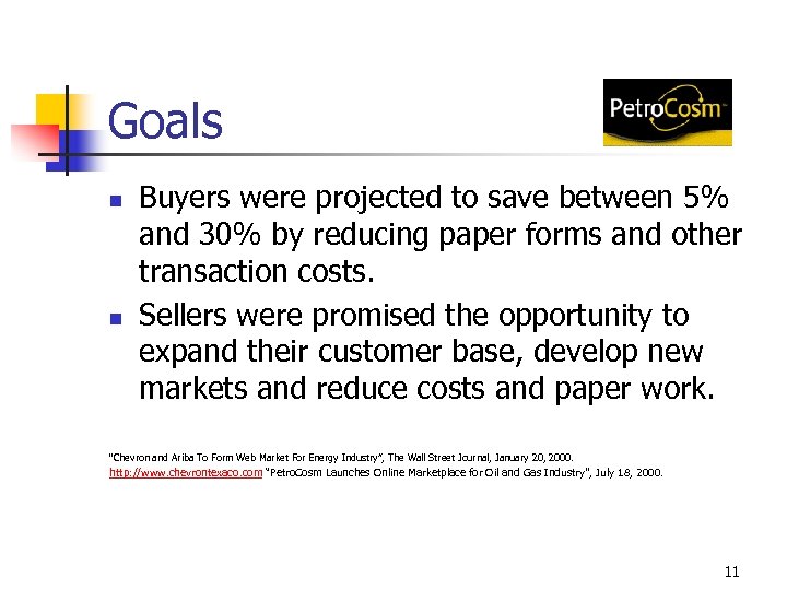 Goals n n To create the first B 2 B marketplace owned by buyers and suppliers across the energy industry. Benefits such as aggregated purchasing, lower transaction costs and seamless access to global markets could drive $11 billion in oil and gas industry savings and efficiencies. http: //www. chevrontexaco. com “Petrocosm announcement”, March 23, 2000. 10