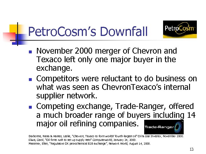 Implementation n Exchange went live in July of 2000. Chevron planned to target a “substantial portion” of its annual $10 billion in spending through Petro. Cosm. Former Halliburton VP, Norman C. Chambers, selected as Chief Executive Officer. http: //www. chevrontexaco. com “Petro. Cosm Launches Online Marketplace for Oil and Gas Industry”, July 18, 2000. 12
