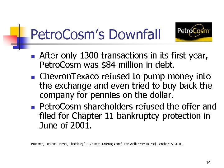 Petro. Cosm’s Downfall n n n November 2000 merger of Chevron and Texaco left only one major buyer in the exchange. Competitors were reluctant to do business on what was seen as Chevron. Texaco’s internal supplier network. Competing exchange, Trade-Ranger, offered a much broader range of buyers including 14 major oil refining companies. Darbonne, Nissa & Haines, Leslie, “Chevron, Texaco to form worlds’ fourth-largest oil” Oil & Gas Investor, November 2000. Sliwa, Carol, “Oil firms rush to set up supply nets” Computerworld, January 24, 2000. Messmer, Ellen, “Regulators OK petrochemical B 2 B exchange”, Network World, August 14, 2000. 13