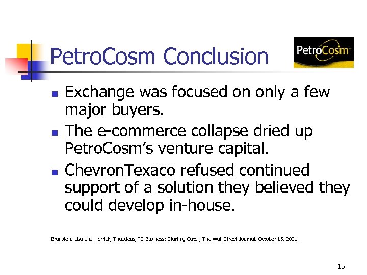 Petro. Cosm’s Downfall n n n After only 1300 transactions in its first year, Petro. Cosm was $84 million in debt. Chevron. Texaco refused to pump money into the exchange and even tried to buy back the company for pennies on the dollar. Petro. Cosm shareholders refused the offer and filed for Chapter 11 bankruptcy protection in June of 2001. Bransten, Lisa and Herrick, Thaddeus, “E-Business: Starting Gate”, The Wall Street Journal, October 15, 2001. 14