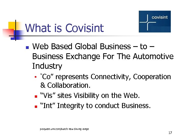 What is Covisint n Web Based Global Business – to – Business Exchange For The Automotive Industry n n n “Co” represents Connectivity, Cooperation & Collaboration. “Vis” sites Visibility on the Web. “Int” Integrity to conduct Business. proquest. umi. com/auto’s new driving range 17