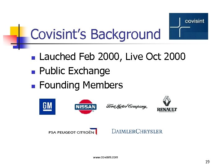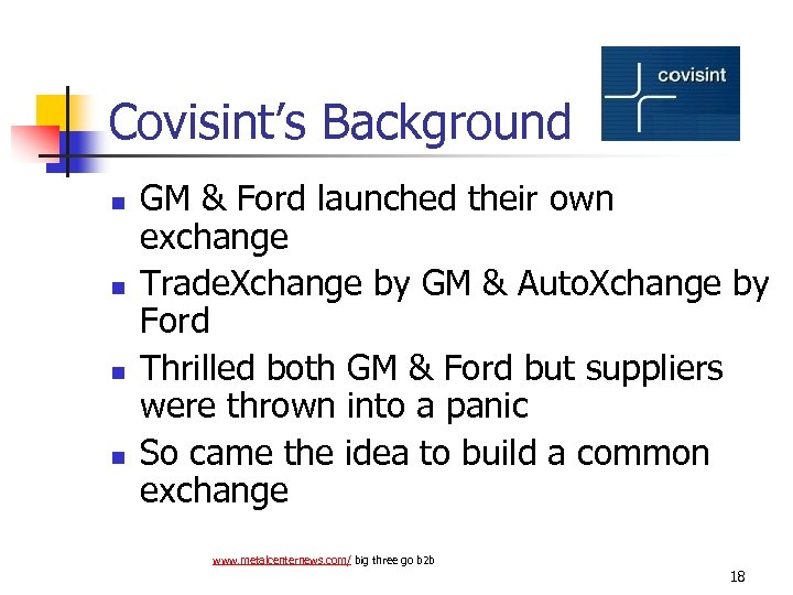 Covisint’s Background n n GM & Ford launched their own exchange Trade. Xchange by GM & Auto. Xchange by Ford Thrilled both GM & Ford but suppliers were thrown into a panic So came the idea to build a common exchange www. metalcenternews. com/ big three go b 2 b 18