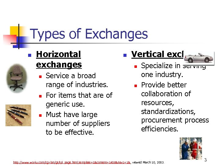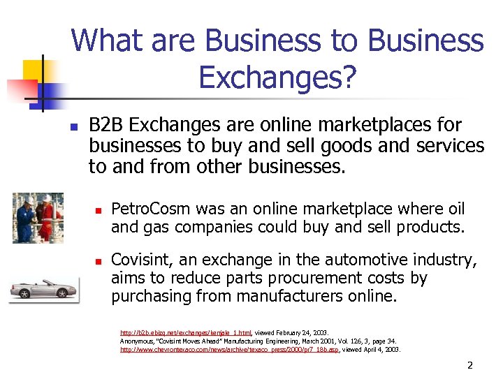 What are Business to Business Exchanges? n B 2 B Exchanges are online marketplaces for businesses to buy and sell goods and services to and from other businesses. n n Petro. Cosm was an online marketplace where oil and gas companies could buy and sell products. Covisint, an exchange in the automotive industry, aims to reduce parts procurement costs by purchasing from manufacturers online. http: //b 2 b. ebizq. net/exchanges/kenjale_1. html, viewed February 24, 2003. Anonymous, “Covisint Moves Ahead” Manufacturing Engineering, March 2001, Vol. 126, 3, page 34. http: //www. chevrontexaco. com/news/archive/texaco_press/2000/pr 7_18 b. asp, viewed April 4, 2003. 2