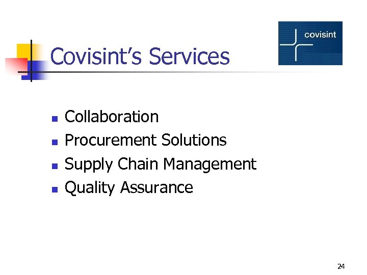 Covisint’s Services n n Collaboration Procurement Solutions Supply Chain Management Quality Assurance 24