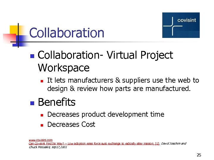 Collaboration n Collaboration- Virtual Project Workspace n n It lets manufacturers & suppliers use the web to design & review how parts are manufactured. Benefits n n Decreases product development time Decreases Cost www. covisint. com Can Covisint Find Its Way? -- Low adoption rates force auto exchange to radically alter mission; [1]; David Joachim and Chuck Moozakis, sep 17, 2001 25