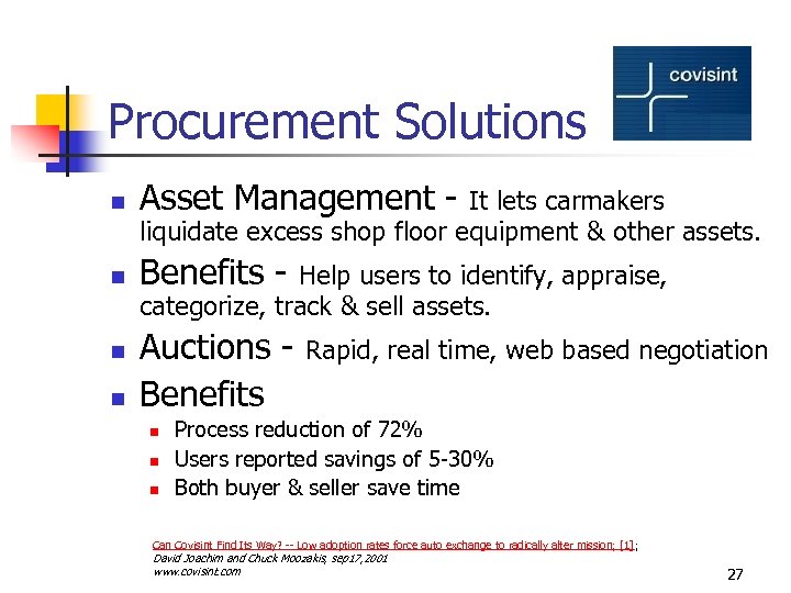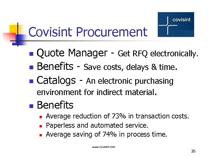 Covisint Procurement Quote Manager - Get RFQ electronically. n Benefits - Save costs, delays & time. n Catalogs - An electronic purchasing environment for indirect material. n Benefits n n Average reduction of 73% in transaction costs. Paperless and automated service. Average saving of 74% in process time. www. covisint. com 26