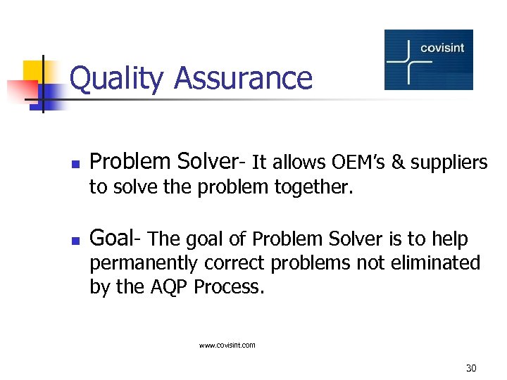 Quality Assurance n Problem Solver- It allows OEM’s & suppliers to solve the problem together. n Goal- The goal of Problem Solver is to help permanently correct problems not eliminated by the AQP Process. www. covisint. com 30