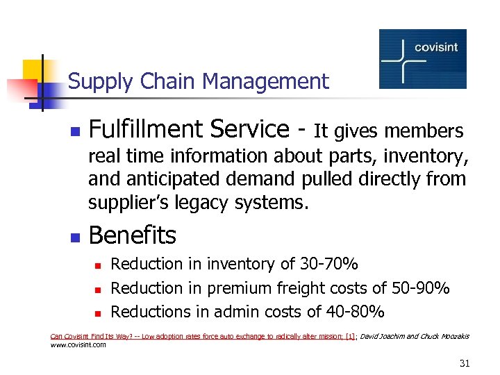 Supply Chain Management n Fulfillment Service - n Benefits It gives members real time information about parts, inventory, and anticipated demand pulled directly from supplier’s legacy systems. n n n Reduction in inventory of 30 -70% Reduction in premium freight costs of 50 -90% Reductions in admin costs of 40 -80% Can Covisint Find Its Way? -- Low adoption rates force auto exchange to radically alter mission; [1]; David Joachim and Chuck Moozakis www. covisint. com 31
