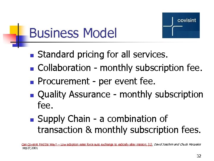Business Model n n n Standard pricing for all services. Collaboration - monthly subscription fee. Procurement - per event fee. Quality Assurance - monthly subscription fee. Supply Chain - a combination of transaction & monthly subscription fees. Can Covisint Find Its Way? -- Low adoption rates force auto exchange to radically alter mission; [1]; David Joachim and Chuck Moozakis sep 27, 2001 32