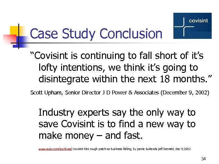Is it a Success? n n The founders account for 80 to 90 percent of revenue. It laid off one-third of its staff of 300. Revenue $60 million, well short of the projected $100 million. Covisint will broker the sales of $50 billion but it’s a far cry from the estimated $240 billion. www. detnews. com/ covisint struggles to survive in emarketplace by doron levin, bloomberg news, august 23, 2002 proquest. umi. com/ Covisint’s last chance, christopher koch, dec 1 2002 www. auto. com archives/ covisint hits rough patch as business falling, jamie butters, december 9, 2002 33