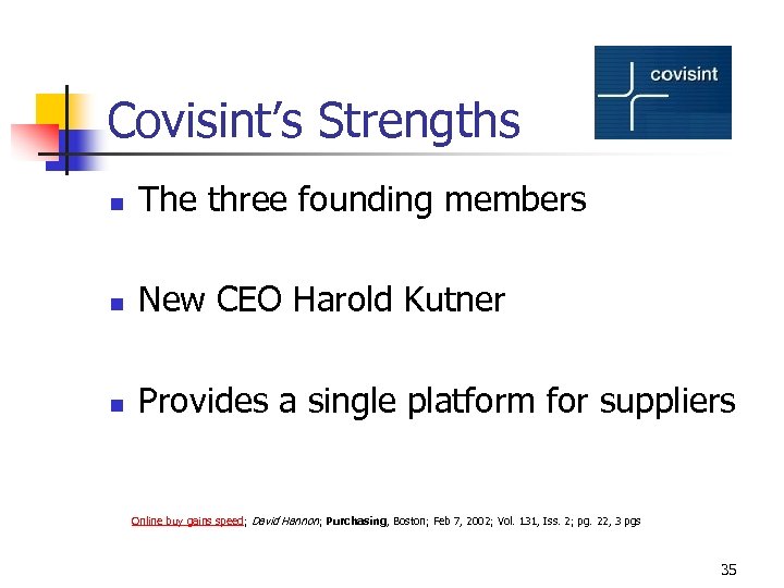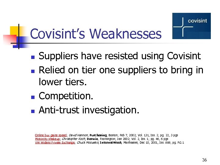 Covisint’s Strengths n The three founding members n New CEO Harold Kutner n Provides a single platform for suppliers Online buy gains speed; David Hannon; Purchasing, Boston; Feb 7, 2002; Vol. 131, Iss. 2; pg. 22, 3 pgs 35