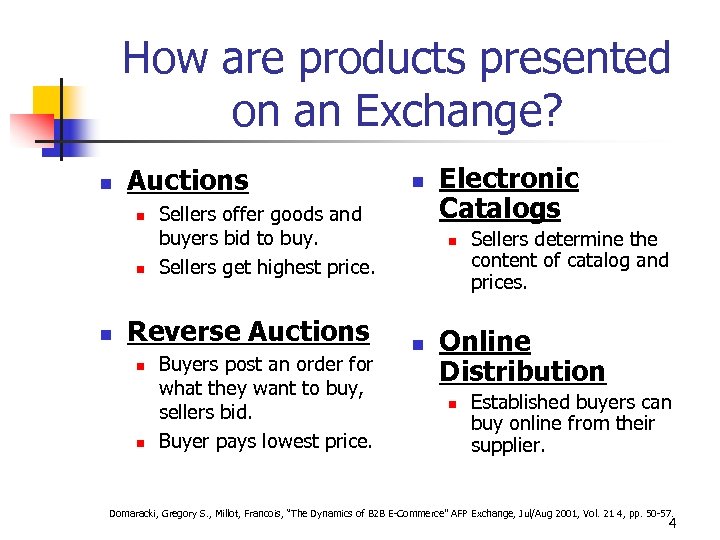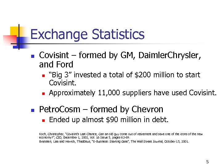 How are products presented on an Exchange? n Auctions n n n Sellers offer goods and buyers bid to buy. Sellers get highest price. Reverse Auctions n n n Buyers post an order for what they want to buy, sellers bid. Buyer pays lowest price. Electronic Catalogs n n Sellers determine the content of catalog and prices. Online Distribution n Established buyers can buy online from their supplier. Domaracki, Gregory S. , Millot, Francois, “The Dynamics of B 2 B E-Commerce” AFP Exchange, Jul/Aug 2001, Vol. 21 4, pp. 50 -57. 4