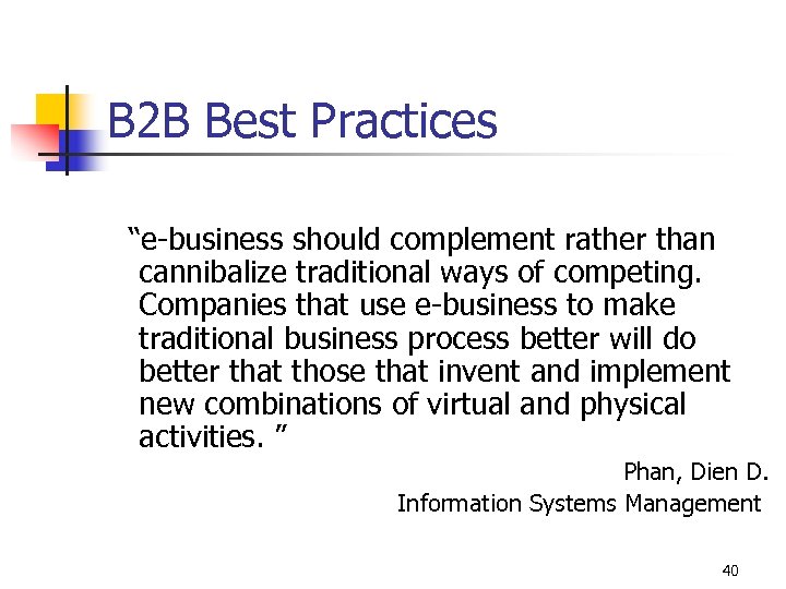 B 2 B Best Practices “e-business should complement rather than cannibalize traditional ways of competing. Companies that use e-business to make traditional business process better will do better that those that invent and implement new combinations of virtual and physical activities. ” Phan, Dien D. Information Systems Management 40