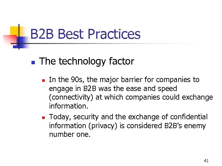 B 2 B Best Practices n The technology factor n n In the 90 s, the major barrier for companies to engage in B 2 B was the ease and speed (connectivity) at which companies could exchange information. Today, security and the exchange of confidential information (privacy) is considered B 2 B’s enemy number one. 41
