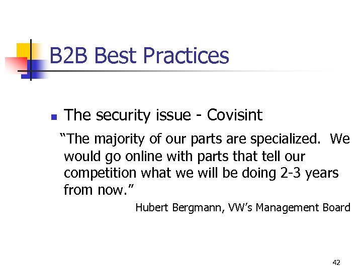B 2 B Best Practices n The security issue - Covisint “The majority of our parts are specialized. We would go online with parts that tell our competition what we will be doing 2 -3 years from now. ” Hubert Bergmann, VW’s Management Board 42