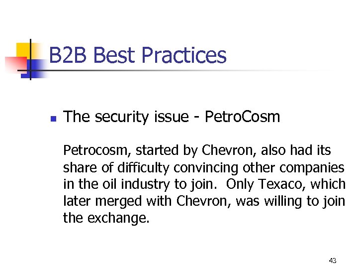 B 2 B Best Practices n The security issue - Petro. Cosm Petrocosm, started by Chevron, also had its share of difficulty convincing other companies in the oil industry to join. Only Texaco, which later merged with Chevron, was willing to join the exchange. 43