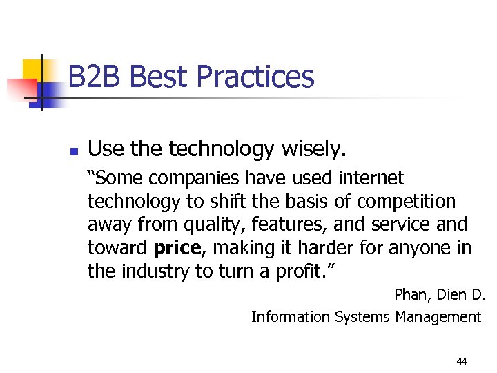 B 2 B Best Practices n Use the technology wisely. “Some companies have used internet technology to shift the basis of competition away from quality, features, and service and toward price, making it harder for anyone in the industry to turn a profit. ” Phan, Dien D. Information Systems Management 44